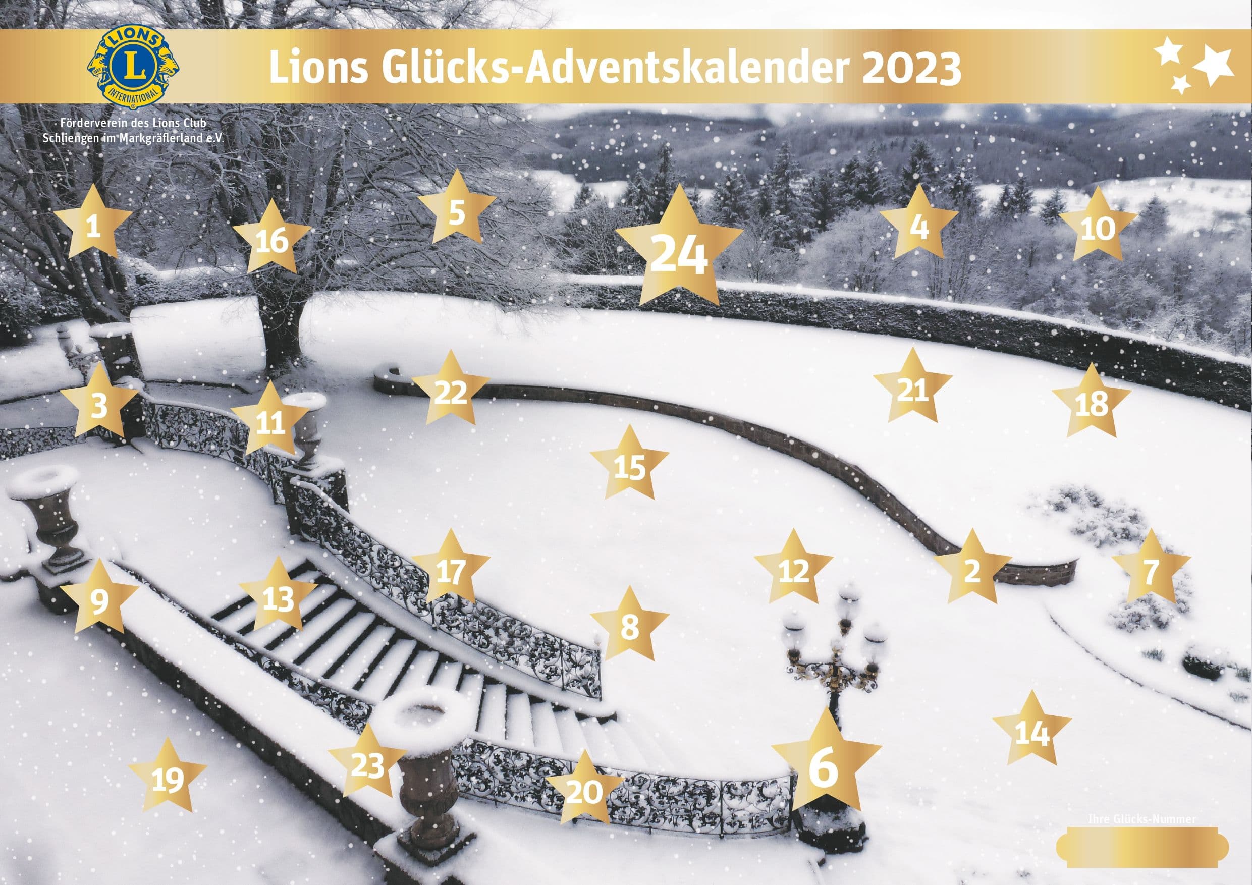 Auch in diesem Jahr findet der Adventskalender des Lions Club Schliegen im Markgräflerland statt. Die Gewinnnummern erscheinen täglich auf der Homepage www.lionsclub-schliengen.de, verpassen Sie nicht diese regelmäßig zu überprüfen.