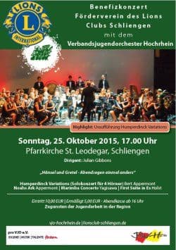 Das Verbandsjugendblasorchester Hochrhein besteht seit über 25 Jahren. Es ermöglicht jungen und besonders begabten Musikern, außerhalb ihrer örtlichen Musikvereine in einem sinfonischen Blasorchester anspruchsvolle Musikliteratur einzustudieren und aufzuführen. Jeder Musiker beherrscht exzellent sein Instrument. Die Gruppierung erhielt zahlreiche Spitzenpreise und unternahm regelmäßig erfolgreiche Auslandstourneen. Der englische Hornist, Musikpädagoge und Dirigent Julian Gibbons leitet das Orchester seit vielen Jahren. Er ist dem Lions Club Schliengen durch seine Mitwirkung bei inzwischen zwölf Benefizkonzerten herzlich verbunden.