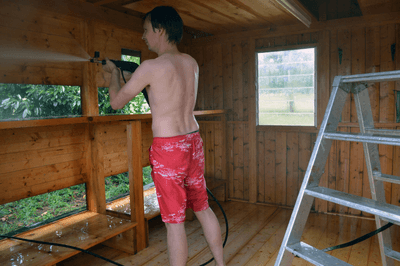 Morgens (Aufstehen im Strohlager war um 5:45 Uhr angesagt) und abends wurden die Kühe gemolken und der Stall ausgemistet. Daneben gab es einige Arbeiten, bei denen viele helfende Hände willkommen waren. So wurde ein großes Bienenhaus komplett ausgebaut, damit das Haus selbst sowie das gesamte Inventar Stück für Stück abgestrahlt werden konnten. Eine vergleichbare Arbeit war an einem anderen Tag der Ausbau und die Reinigung des Hühnerstalls und aller Einzelteile seines Interieurs.