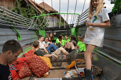 An einem Nachmittag wurden an den Kopfenden eines Kartoffelackers Kartoffeln von Hand geerntet. Und an einem anderen Tag ging es in den Wald zum Holz aufschichten.