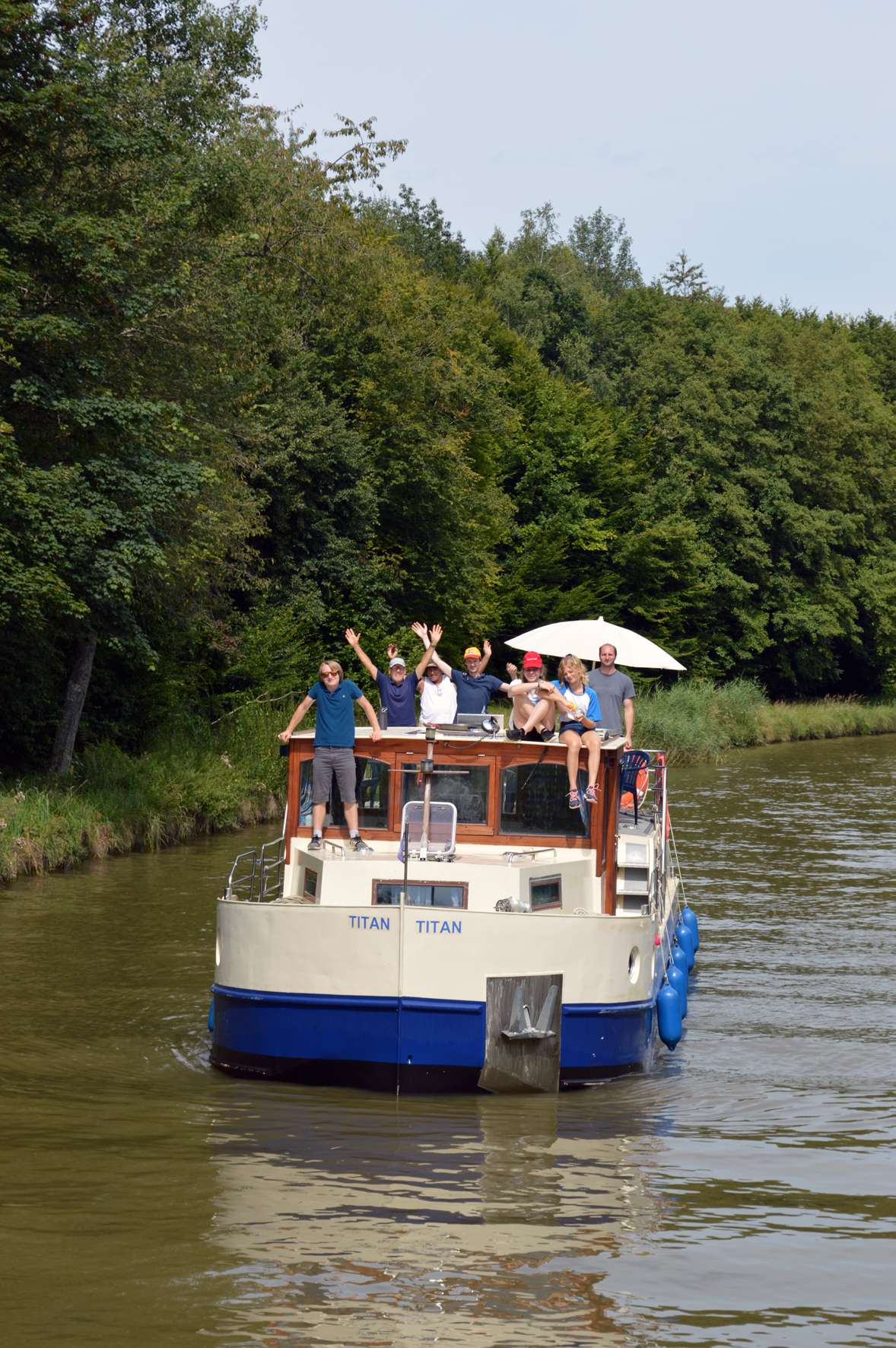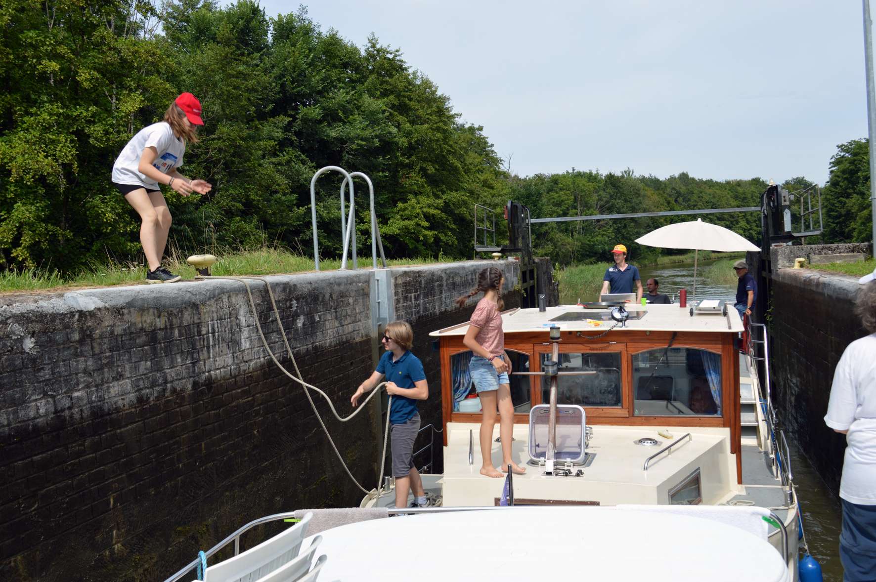 Nur vier Tage später gab es für fünfzehn Teilnehmer am Sommercamp ein Wiedersehen bei einer Hausbootfahrt in Lothringen. Von Niderviller aus wurden der Rhein-Marne-Kanal und der Saarkanal fünf Tage lang befahren. Ziel war das Städtchen Harskirchen, in dem „der letzte Müller an der Saar“ auf die trinationale Reisegruppe wartete. Bei einer Führung durch die mit Wasserkraft betriebene alte Mühle, in der auf vier Stockwerken gearbeitet wird, wurde die seit hundert Jahren unverändert gebliebene Mechanik erklärt. Anschließend konnte das hier produzierte Weizenmehl in ansprechender Form verkostet werden: In der „Auberge du Moulin“ wurden Pizzen und Flammkuchen genossen, à discretion, versteht sich. Ein weiterer Höhepunkt der Unternehmung, die durch einen Zuschuss in Höhe von 4000 Euro aus dem Jugendfonds der Deutsch-Französisch-Schweizerischen Oberrheinkonferenz ermöglicht wurde, war ein Ganztagesausflug in den einzigartigen Tierpark von Sainte-Croix. Hier kamen die Jugendlichen unter anderem Braunbären, weißen arktischen Wölfen, Luchsen, Geiern, Hirschen und Pelikanen ganz nahe. Eine größere Herausforderung für die Jugendlichen aus den drei Ländern war das Schleusen: 17 Mal wurde auf dem Hinweg talwärts und 17 Mal auf dem Rückweg bergwärts geschleust. Hier wurde das Halten der Boote zu einer Gemeinschaftsaufgabe nach dem Motto „Wir ziehen am selben Strang“.