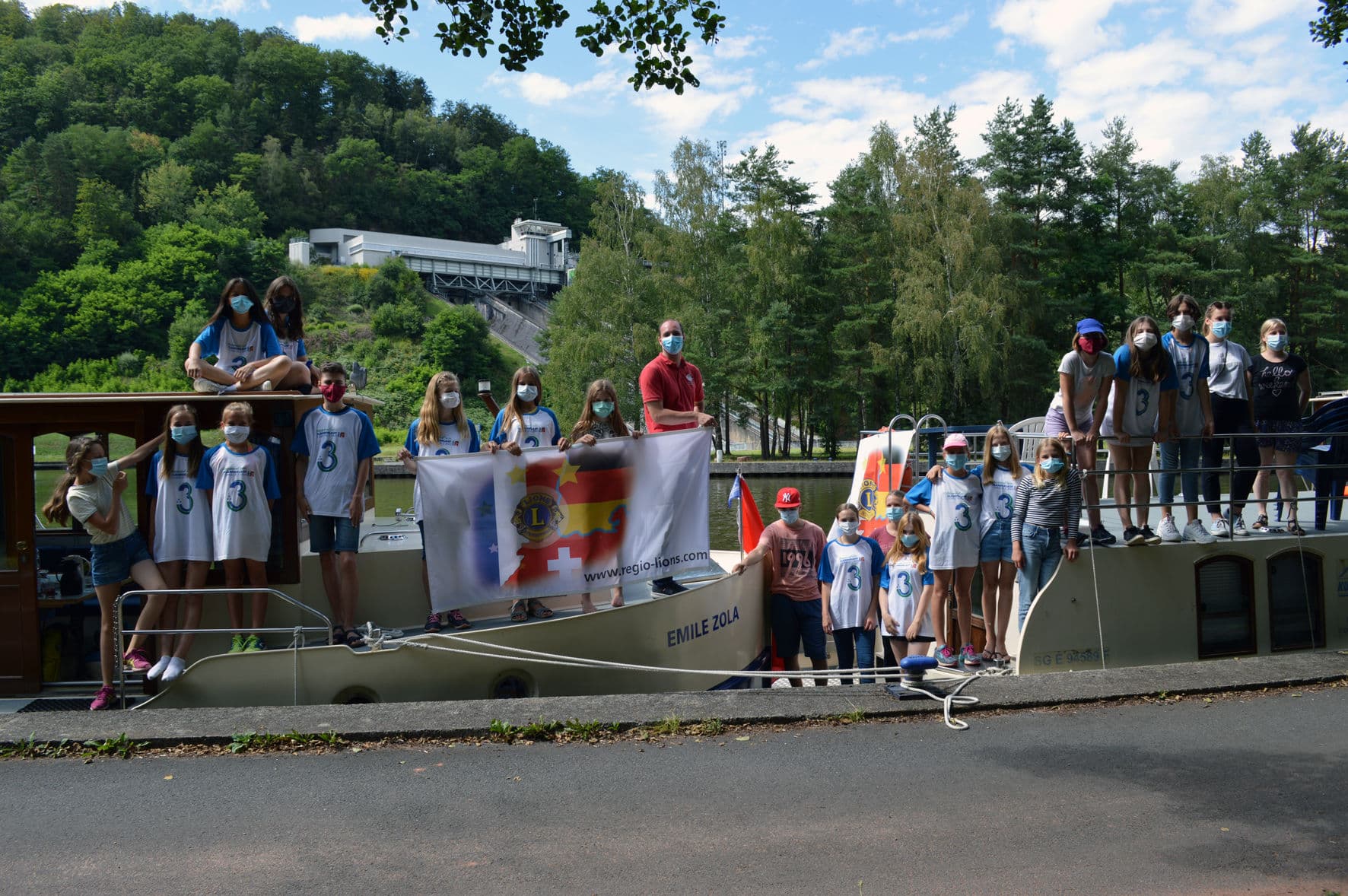 Acht Jugendliche aus den Départements Haut-Rhin und Bas-Rhin sowie je sechs aus Lörrach und aus Basel folgten der Einladung der Regio Lions und verbrachten Ende Juli gemeinsam vier Tage auf drei großen Hausbooten. Nach der Anreise mit dem Zug bzw. mit Privatautos stand nach einem ersten Essen gleich ein besonderer Workshop auf dem Programm: Unter Anleitung eines geübten Slackline-Spezialisten durften sich alle, die wollten beim Balancieren auf dem Gurtband probieren. Alle Betreuer waren erstaunt darüber, wie couragiert sich vor allem die Mädchen aus den drei Ländern auf das Seil begaben. Hoch konzentriert tasteten sich die Mädchen aus Lörrach, Basel, Saint-Louis, Colmar und Strasbourg über das zunächst zwischen zwei Bäumen über Land gespannte Seil. Anschließend folgte für die ganz Wagemutigen eine Gaudi mit feuchtfröhlichem Ausgang: Das Laufen über das über den Kanal gespannte Seil mit vorprogrammiertem Absprung ins wohltemperierte Wasser.