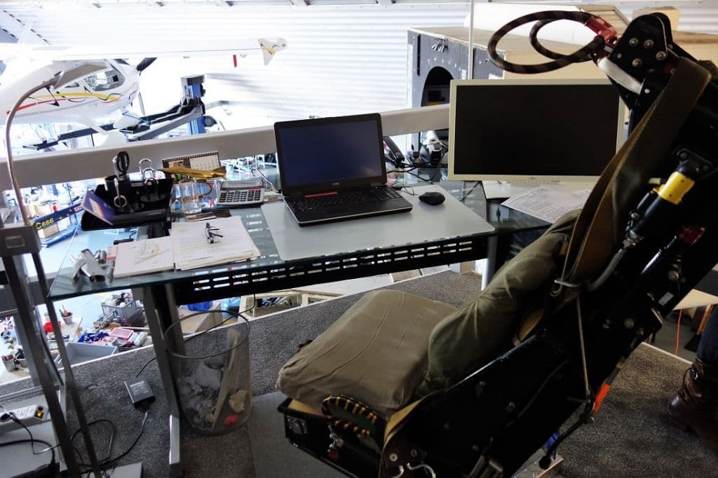 Der Hangar selbst ist übrigens ein „bombensicherer“ ehemaliger Phantom- Unterstand der Bundesluftwaffe und beherbergt jedes nur erdenkliche Fluggerät oder dessen Bestandteile … . Klar, dass der „Chef“ auf einem Schleudersitz residiert.