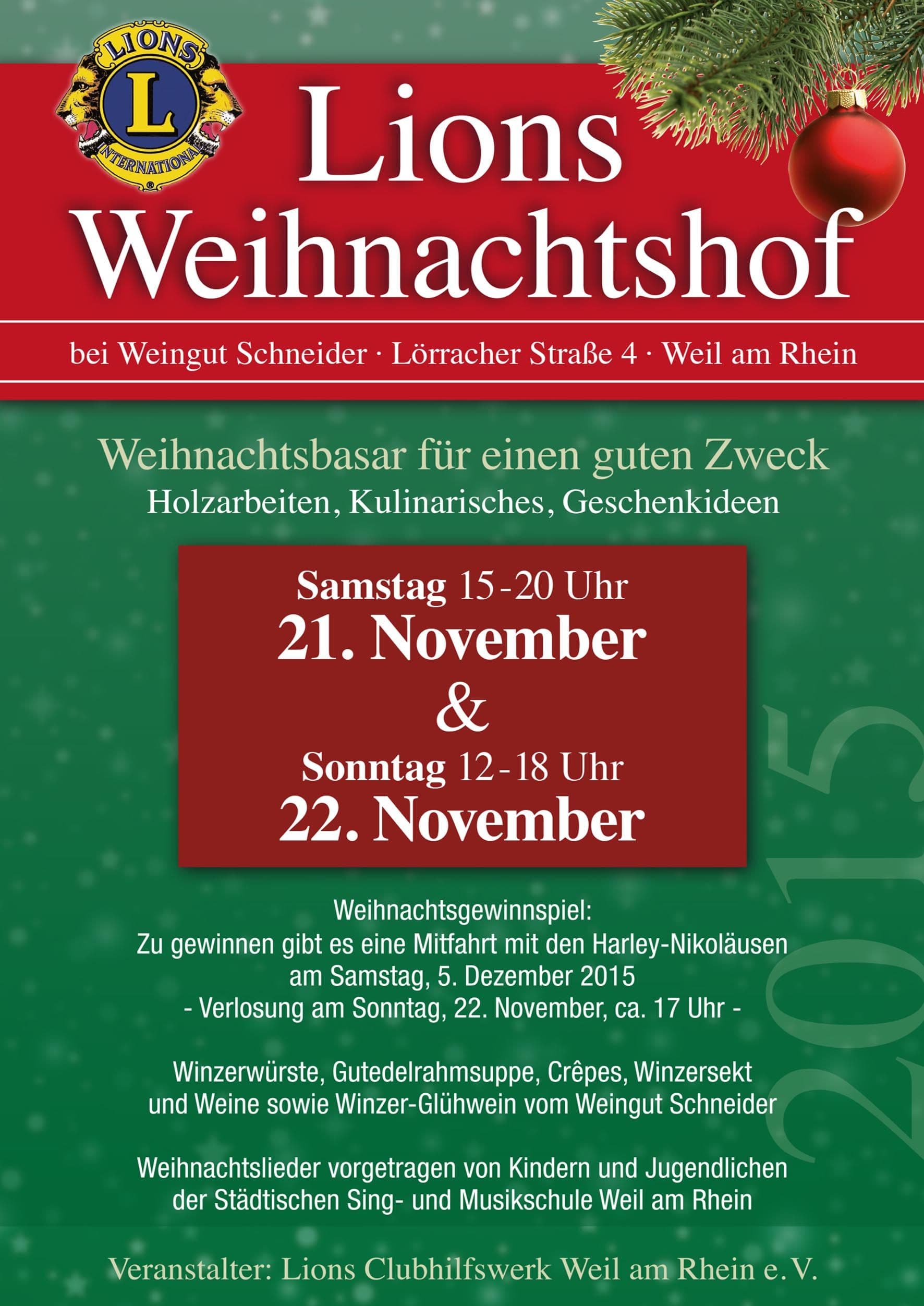 In Buden und an Ständen gibt es dann Weihnachtsdekorationen, Geschenkartikel aus Holz, selbst gemachte Marmelade, Plätzchen und vieles mehr zu kaufen. Veranstaltet wird der „Weihnachtshof“ im Weingut vom Hilfswerk des Lions Clubs Weil am Rhein. Der Weiler Club sammelt Geld für soziale Projekte in der Region und weltweit. Auch die Jugend des Lions Clubs, die „Leos“, engagiert sich beim „Weihnachtshof“ für den guten Zweck und verkauft frisch gebackene Crêpes. Für vorweihnachtliche Atmosphäre sorgen Kinder und Jugendliche, die auf ihren Instrumenten spielen.